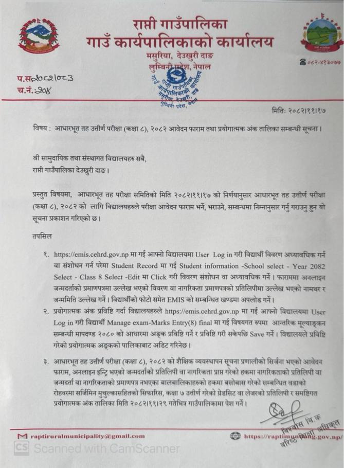 आधारभुत उत्तीर्ण परिक्षा (कक्षा ८), २०८२ आवेदन फाराम तथा प्रयोगात्मक अंक तालिका सम्बन्धी सूचना ।