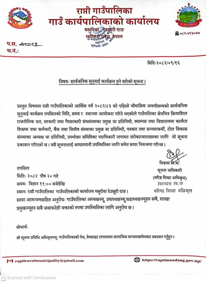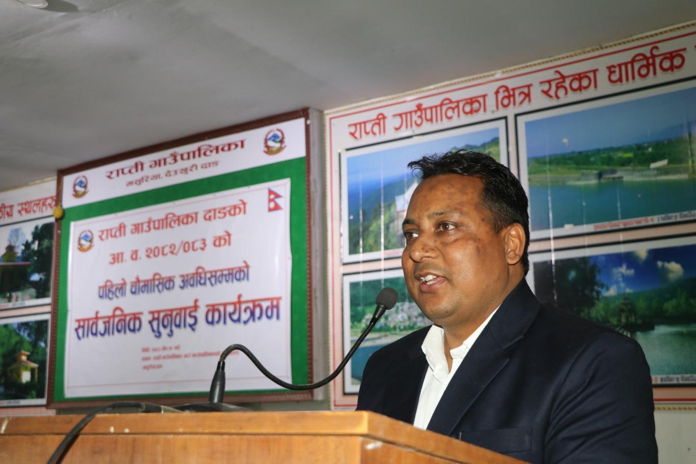 स्थानीय तहमा पारदर्शिता र जवाफदेहिता प्रवर्द्धन गर्ने महत्वपूर्ण औजारका रूपमा हेरिने सार्वजनिक सुनुवाइ कार्यक्रम राप्ती गाउँपालिकाले प्रत्येक चौमासिक रूपमा गर्दै आइरहेको छ।