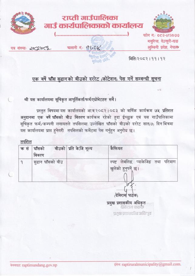 » एक वर्षे घाँस सुडानको बीउको दररेट (कोटेशन) पेश गर्ने सम्बन्धी सूचना ।