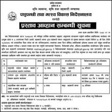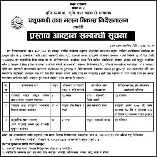 माछा पालक कृषक तथा माछा पाल्न ईच्छुक कृषक लाई प्रदेश नं ५ को सरकार बाट प्रस्तावना आब्हान गरिएको छ । ईच्छुकले सम्पर्क गर्नुहोला । प्रदेश नं ५ को पशुपंक्षि तथा मस्य विकास निर्देशनालय रुपन्देहि
