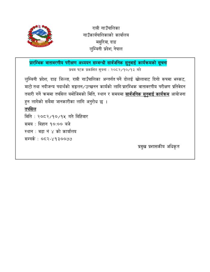 प्रारम्भिक वातावरणीय परीक्षण अध्ययन सम्बन्धी सार्वजनिक सुनुवाई कार्यक्रमको सूचना ।