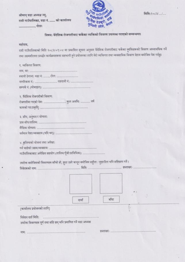 राप्ती गाउँपालिकाको उद्यमशिलता विकास कार्यक्रम आवेदन फारम ।