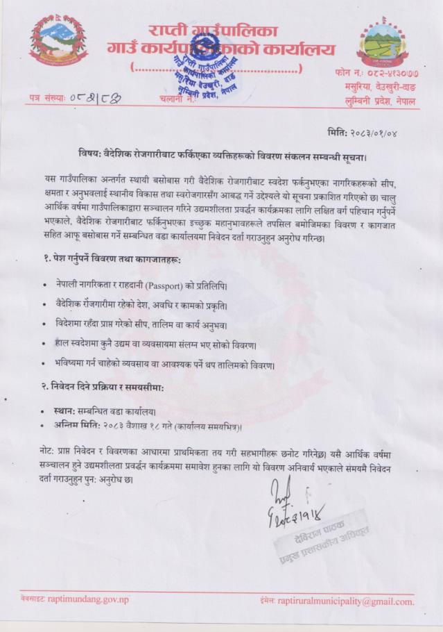 वैदेशिक राेजगारबाट फर्किएका ब्यक्तिहरुकाे विवरण संकलन सम्बन्धी सूचना ।
