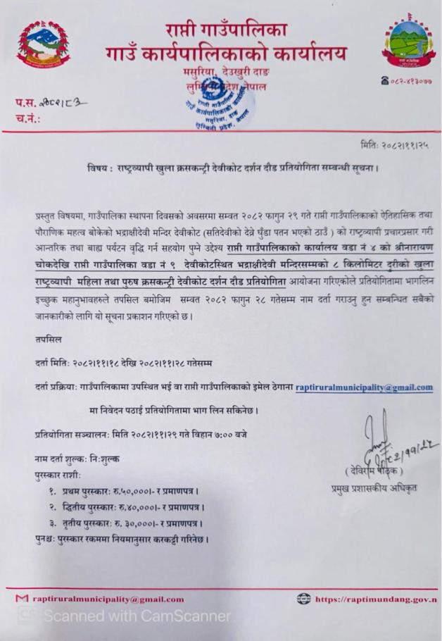 खुला राष्ट्रव्यापी महिला तथा पुरुष क्रसकन्ट्री देवीकाेट दर्शन दौड प्रतियोगिता सम्बन्धी सूचना ।
