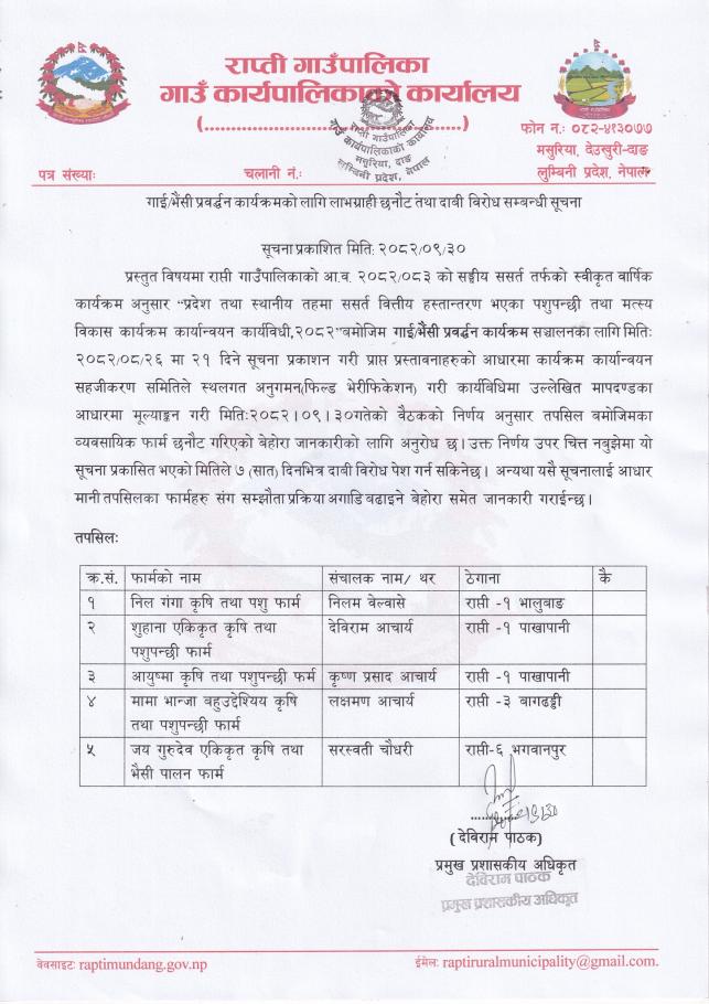गाई/भैंसी प्रवर्द्धन कार्यक्रमको लागि लाभग्राही छनौट तथा दाबी विरोध सम्बन्धी सूचना ।