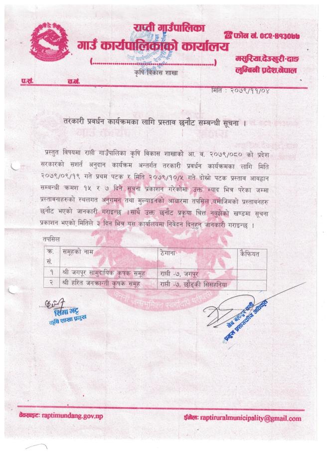 » तरकारी प्रवर्धन कार्यक्रममा प्रस्ताव छनौट सम्वन्धी सूचना ।