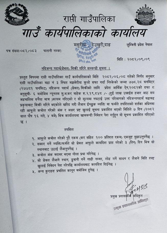 नदीजन्य पदार्थ (ग्रेभल) बिक्री गरिने सम्बन्धी सूचना ।