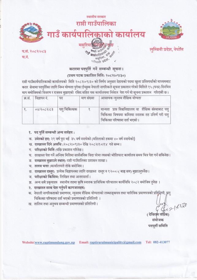 पशु चिकित्सक सेवा करार सम्बन्धी सूचना ।