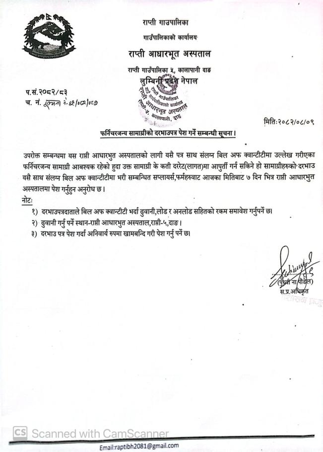 राप्ती आधारभुत अस्पतालकाै लागी फर्निचरजन्य सामग्रीको दरभाउ पत्र पेश गर्ने सम्बन्धी सूचना ।