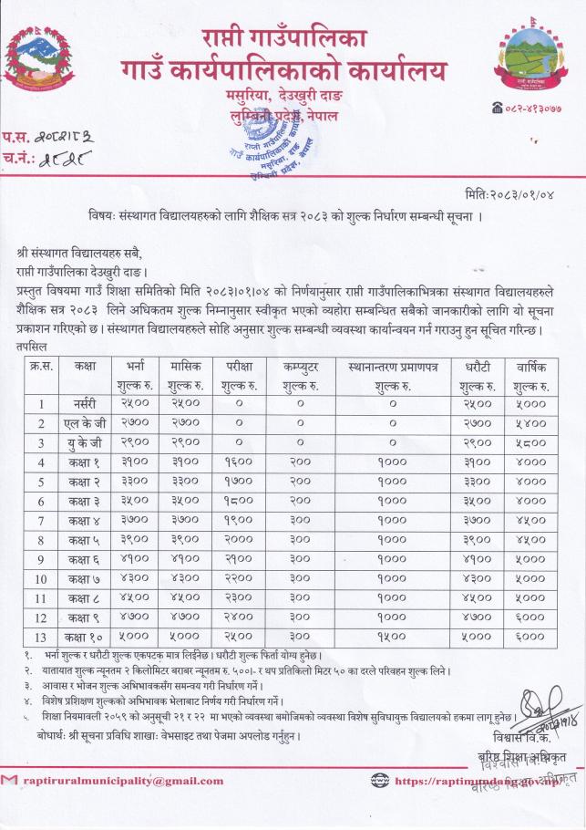 संस्थागत विद्यालयहरुको ल ागि शैक्षिक सत्र २०८३ को शुल्क निर्धारण सम्बन्धी सूचना ।