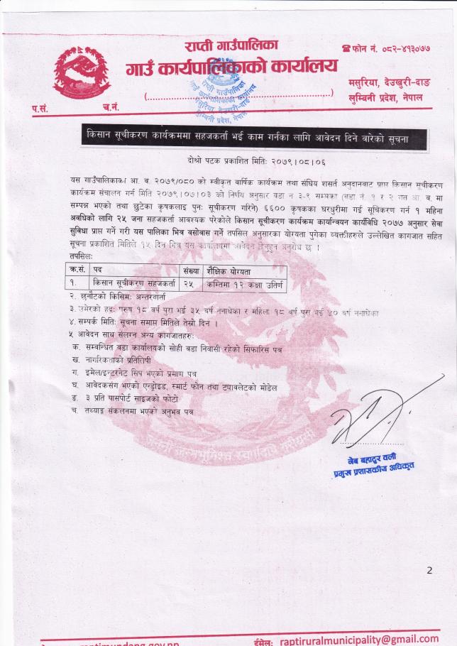 » किसान सूचीकरण कार्यक्रममा सहजकर्ता भई काम गर्नका लागि आवेदन दिने बारेको सूचना ।