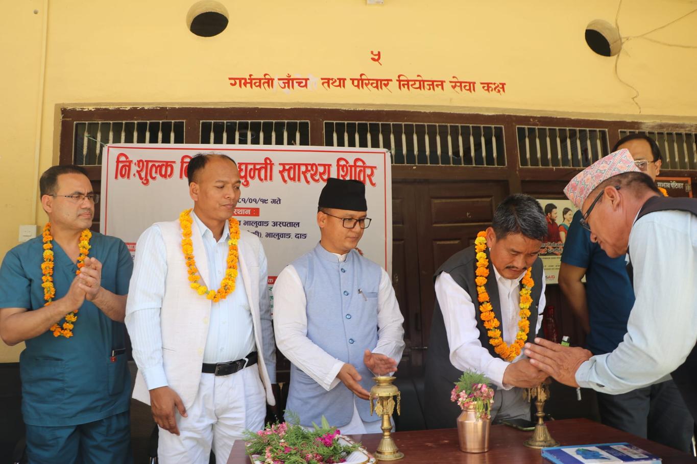 देउखुरी १९ वैशाख। दाङ - देउखुरीकाे राप्ती गाउँपालिका वडा नम्बर एक भालुवाङ स्थित प्रस्तावित ५० शैया भालुवाङ अस्पताल (लालमटिया स्वास्थ्यचौकी) मा बुधबार निःशुल्क विशेषज्ञ घुम्ती स्वास्थ्य शिविर सम्पन्न भएको छ । शिविरमा १ सय २० जना महिला र ८० जना पुरुष गरि २ सय जनाको निःशुल्क स्वास्थ्य परिक्षण गरिएको छ। राप्ती गाउँपालिका दाङको आयोजना तथा प्रकृति हेल्थ केयर प्राइभेट लिमिटेड बुटवल, रूपन्देहीकाे प्राविधिक सहयोगमा शिविर सम्पन्न भएको राप्ती गाउँपालिकाका अध्यक्ष प्रकाश विष्टले जानकारी दिनुभयो । शिविरमा हाडजोर्नी तथा नशा रोग विशेषज्ञ डाक्टर प्रकृतिराज कडेल,डाक्टर राजकृष्ण श्रेष्ठ,जनरल फिजिसियन तथा ग्यास्ट्राेलाेजिष्ट डाक्टर खलिल मियाँ,जनरल सर्जन नविन श्रेष्ठ,रेडियोलाेजिष्ट डाक्टर तृष्णा श्रेष्ठ,स्त्रीरोग विशेषज्ञ डाक्टर दृष्टि पाैडेल लगायत एक दर्जन बढी स्वास्थ्यकर्मीहरुले स्वास्थ्य सेवा प्रदान गर्नुभएको थियो । त्यस्तै शिविरमा स्वास्थ्य चेकजाँच गराएका बिरामीहरुलाई आवश्यक स्वास्थ्य परामर्श दिनुका साथै नि:शुल्क रुपमा औषधी समेत वितरण गरिएको थियो। शिविरकाे लुम्बिनी प्रदेश सरकारका स्वास्थ्यमन्त्री दिपेन्द्र कुमार पुन मगर र पूर्व स्वास्थ्यमन्त्री तथा प्रदेशसभा सदस्य इन्द्रजित थारुले पानसमा बत्ती बालेर संयुक्तरूपमा उद्घाटन गर्नुभएको थियो। साे अवसरमा बाेल्दै उहाँहरुले नागरिककाे सबैभन्दा ठुलो सम्पत्ति स्वास्थ्य भएको बताउदै उनीहरुलाई गाउँघरमै स्वास्थ्य सेवा पुर्याउनु राज्यको कर्तव्य भएको बताउनुभयो थियो ।