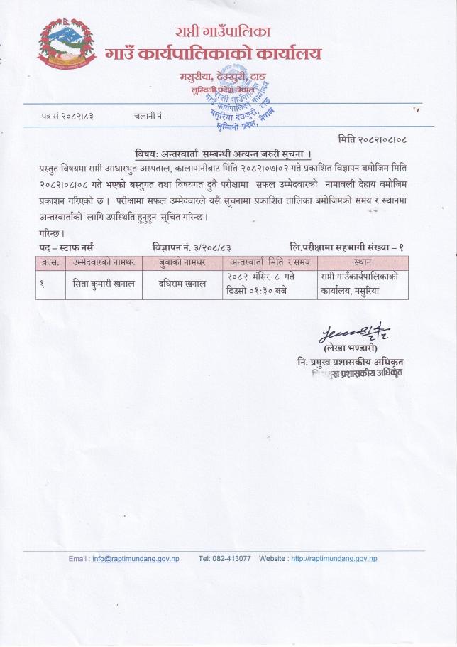 स्टार्फ नर्सको अन्तर्वाता सम्बन्धी सूचना ।