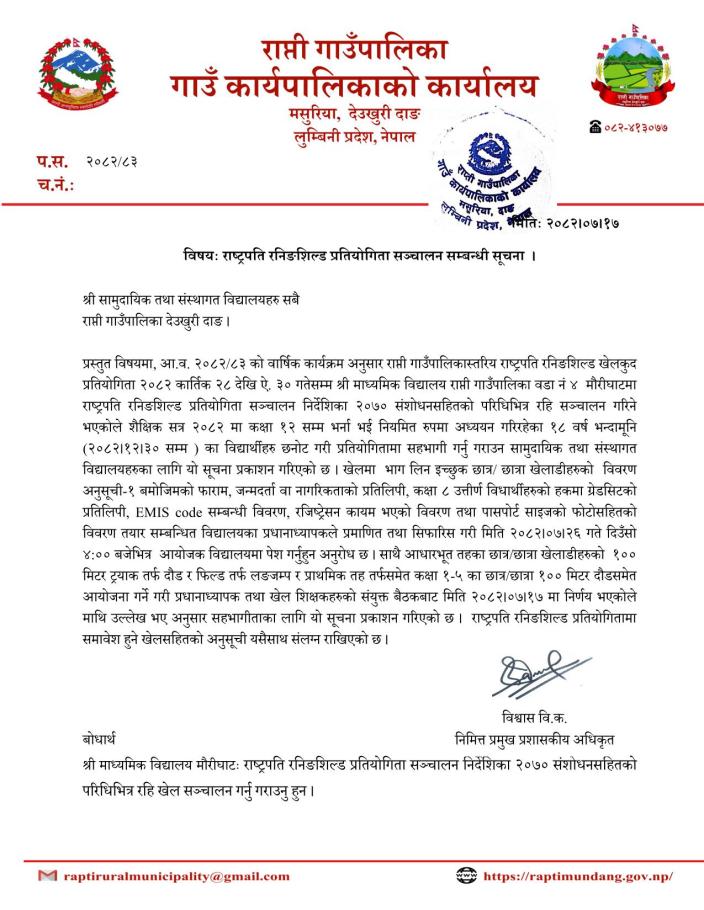 राष्ट्रपति रनिङशिल्ड प्रतियोगिता सञ्चालन सम्बन्धी सूचना ।